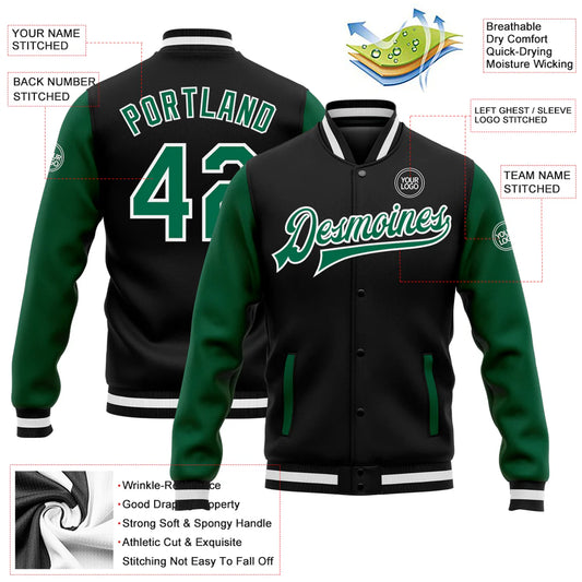 Custom Black Kelly Green-White Bomber Full-Snap Varsity Letterman Two Tone Jacket