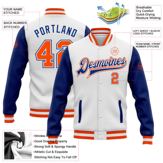 Custom White Orange-Royal Bomber Full-Snap Varsity Letterman Two Tone Jacket