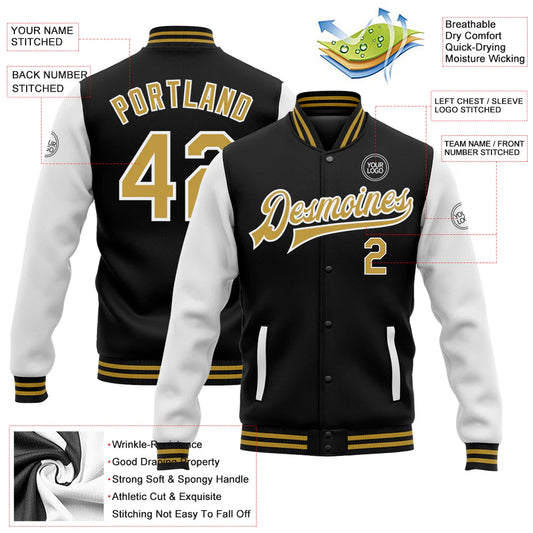 Custom Black Old Gold-White Bomber Full-Snap Varsity Letterman Two Tone Jacket
