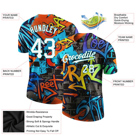 Custom Graffiti Pattern White-Aqua 3D Performance T-Shirt