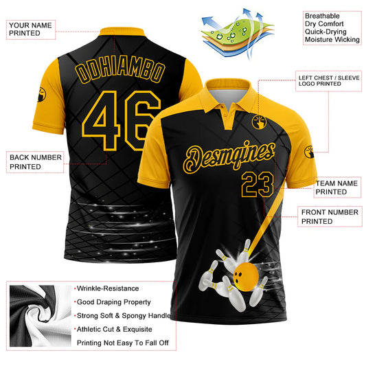 Custom Black Gold 3D Pattern Design Bowling Performance Polo Shirt