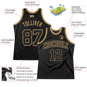Elevate your game with the Custom Black Black-Old Gold Authentic Throwback Basketball Jersey. This jersey combines timeless black with rich old gold accents for a classic, powerful look. Crafted for comfort and durability, it ensures you stay focused and confident on the court. Show off your passion and style with a jersey that honors basketball tradition while keeping you at the top of your game.