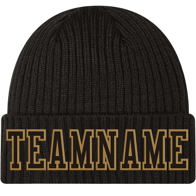 Custom Black Black-Old Gold Stitched Cuffed Knit Hat