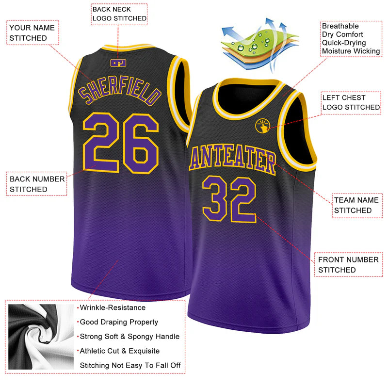 Elevate your game with our Custom Black Purple-Gold Authentic Fade Fashion Basketball Jersey. Designed for style and performance, this jersey will have you standing out on the court. Show off your unique style with a fade design, while staying cool and comfortable with its lightweight material. Dominate the competition in style.