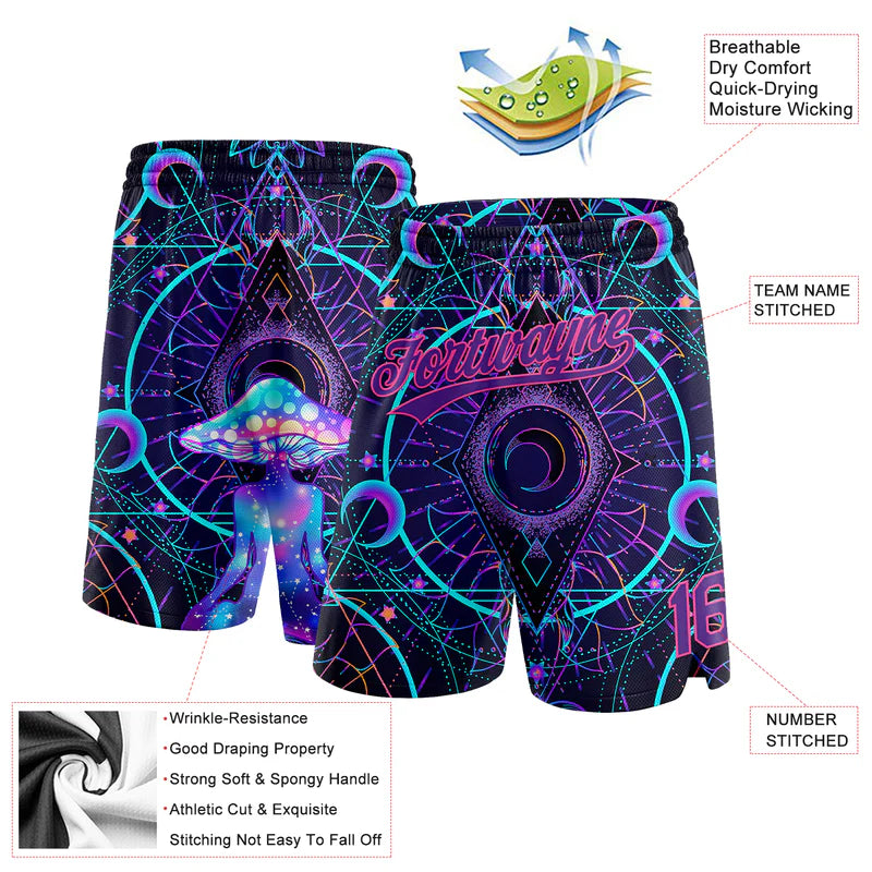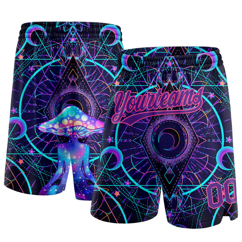 Custom Black Purple-Pink 3D Pattern Magic Mushrooms Over Sacred Geometry Psychedelic Hallucination Authentic Basketball Shorts