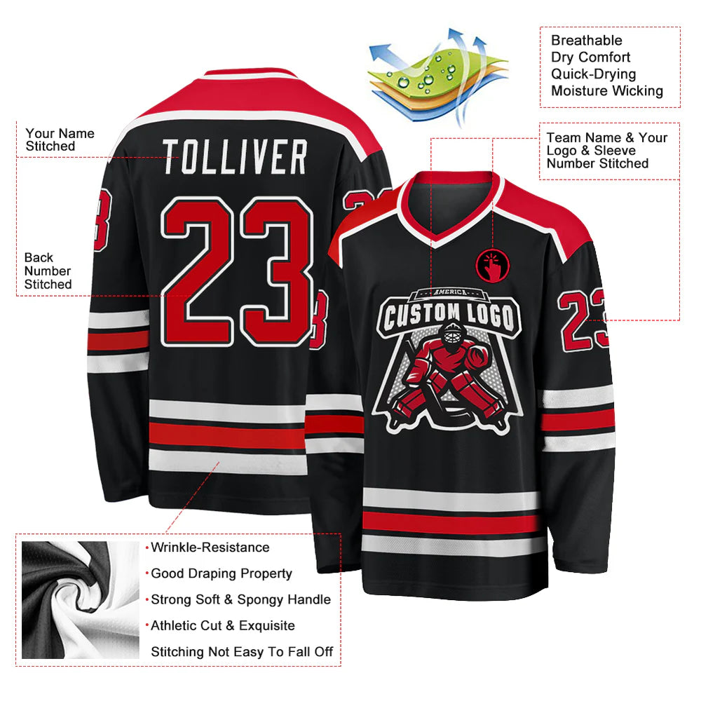 Introducing our Custom Black Red-White Hockey Jersey, designed for comfort and performance. Made with high-quality materials, this jersey is customizable to suit your needs. Stand out on the ice with this sleek and stylish design. Perfect for players who demand the best.