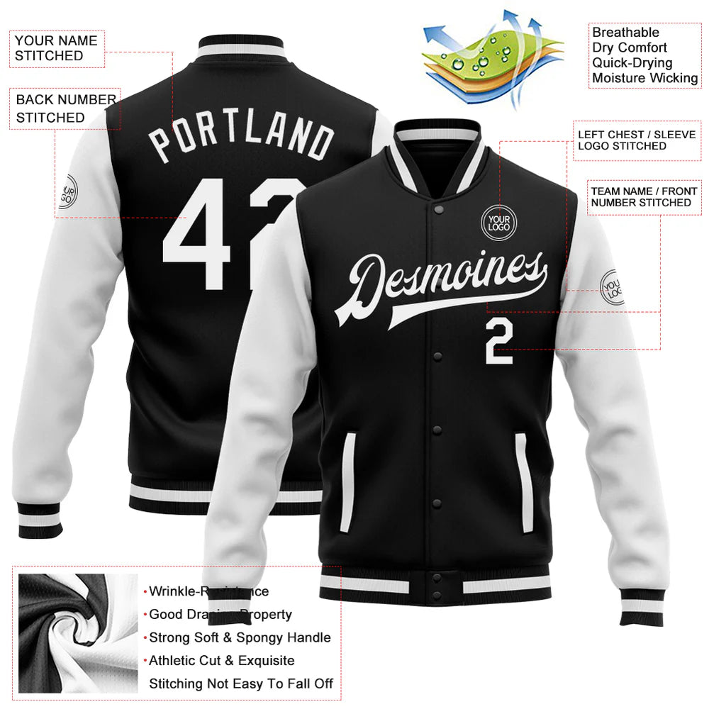 Custom Black White Bomber Full-Snap Varsity Letterman Two Tone Jacket