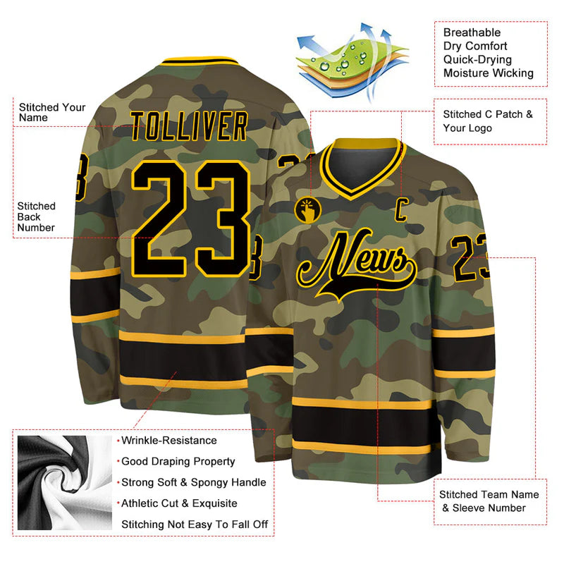 As a custom camo black-gold salute to service hockey jersey, this jersey not only makes you look stylish on the ice, but also supports a great cause. Show your support for your team and our service members with this unique jersey. Constructed with high-quality materials and designed to provide maximum comfort and durability during gameplay.