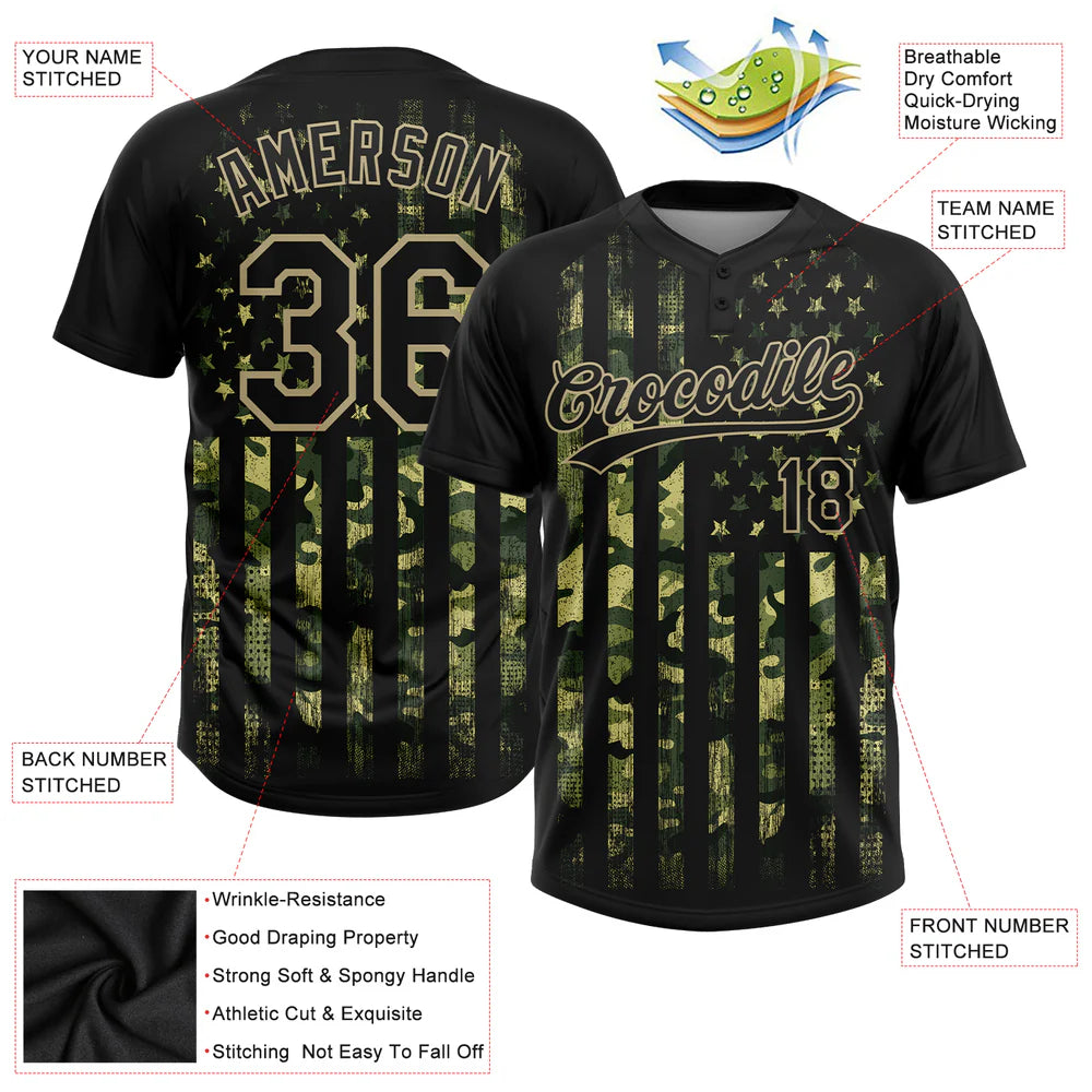 Custom Camo Black-Old Gold 3D American Flag Salute To Service Two-Button Unisex Softball Jersey