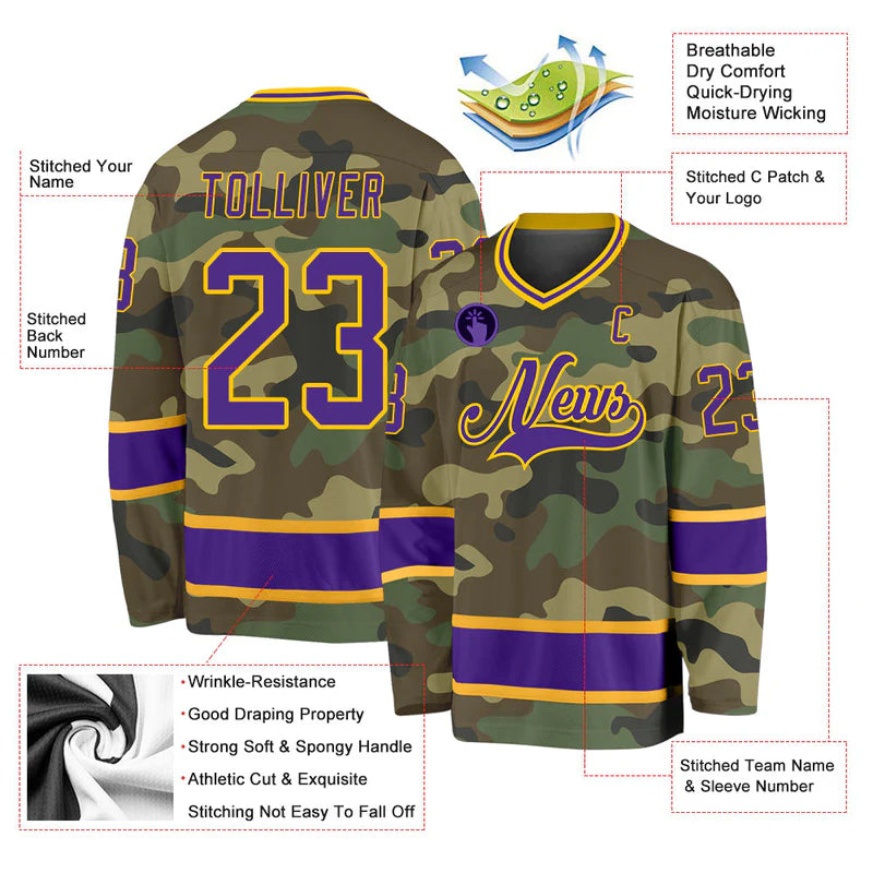 Experience the ultimate blend of style and patriotism with our Custom Camo Purple-Gold Salute To Service Hockey Jersey. Show off your support for your favorite team while honoring our brave servicemen and women. With a custom camo purple-gold design, this jersey is a unique and stylish way to pay tribute. Perfect for any hockey enthusiast and military supporter.