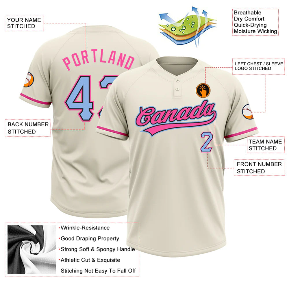 Expertly crafted for both men and women, this Custom Cream Light Blue Black-Pink Two-Button Unisex Softball Jersey is designed to optimize performance and comfort. The custom design and superior materials make it perfect for any softball game, allowing players to focus on their strengths and dominate the field.
