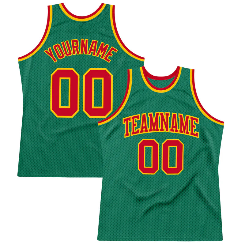 As an industry expert, experience the nostalgia of the courts with our Custom Kelly Green Red-Gold Authentic Throwback Basketball Jersey. With its unique color combination and authentic design, this jersey is perfect for any basketball fan. Made with high-quality materials, it ensures durability and comfort while you play. Represent your team in style and stand out on the court.