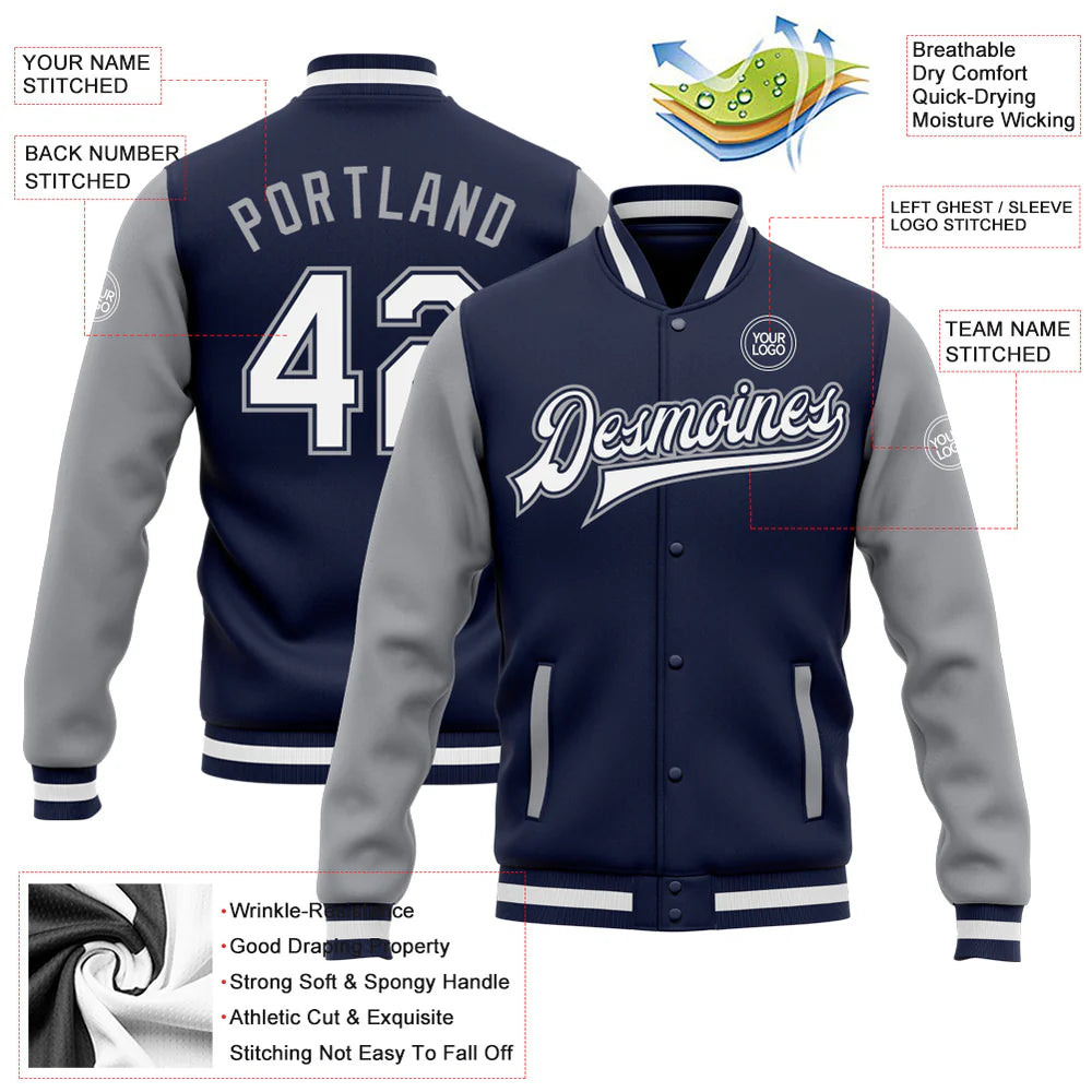 Custom Navy White-Gray Bomber Full-Snap Varsity Letterman Two Tone Jacket