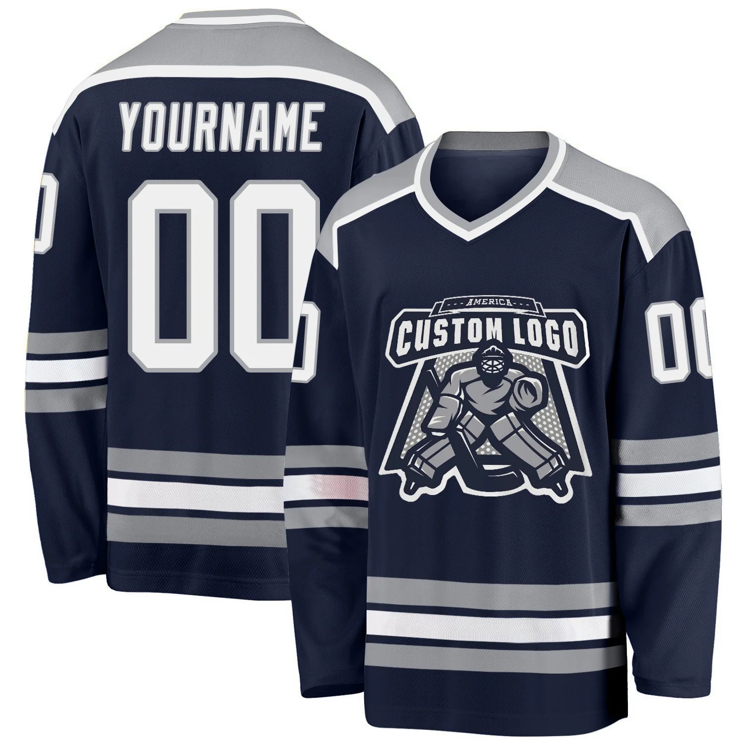 This custom navy white-gray hockey jersey is designed with high-quality materials to ensure maximum comfort and durability on the ice. Its customized design and colors make it stand out from the competition, boosting team morale and showcasing your unique style. Made for champions in mind.