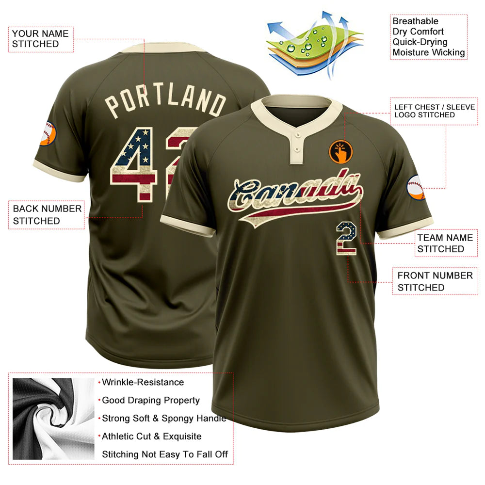 Custom Olive Vintage USA Flag-Cream Salute To Service Two-Button Unisex Softball Jersey