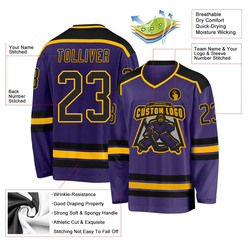 Impress your opponents with our Custom Purple Black-Gold Hockey Jersey. Made with top quality materials, this jersey offers superior comfort and durability. Stand out on the ice with its unique colors and customizable design. Dominate the game with style and performance.