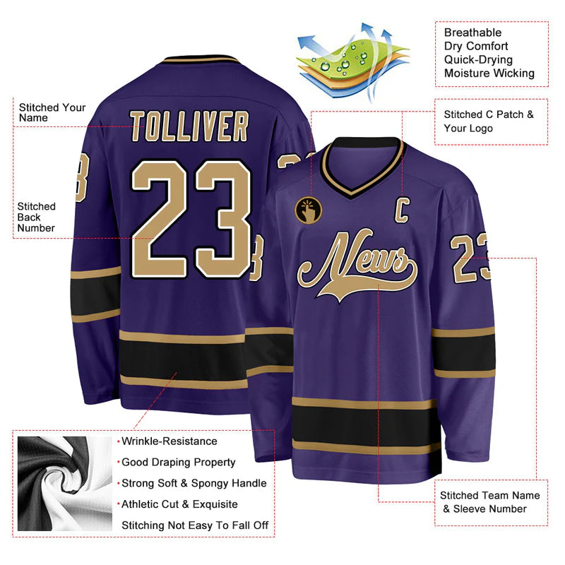 Unleash your inner hockey pro with our Custom Purple Old Gold-Black Hockey Jersey. Constructed with high-quality materials, this jersey ensures maximum comfort and durability on the ice. Stand out from the crowd with its unique purple and old gold-black design. Perfect for players of all levels looking for a stylish and customizable jersey.