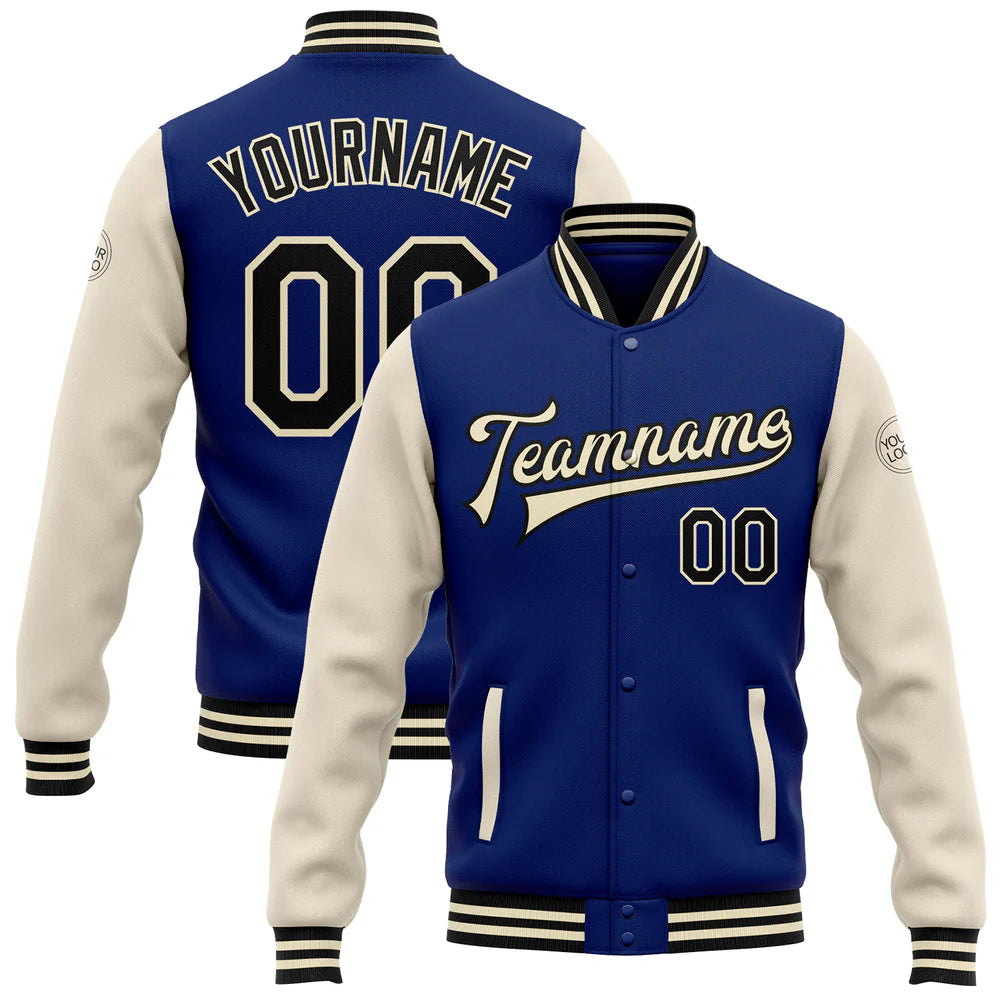 Custom Royal Black-Cream Bomber Full-Snap Varsity Letterman Two Tone Jacket