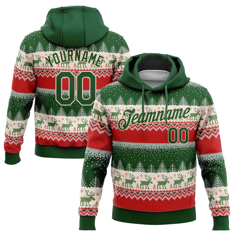 Custom Stitched Red Green-Cream 3D Christmas Reindeers Sports Pullover Sweatshirt Hoodie