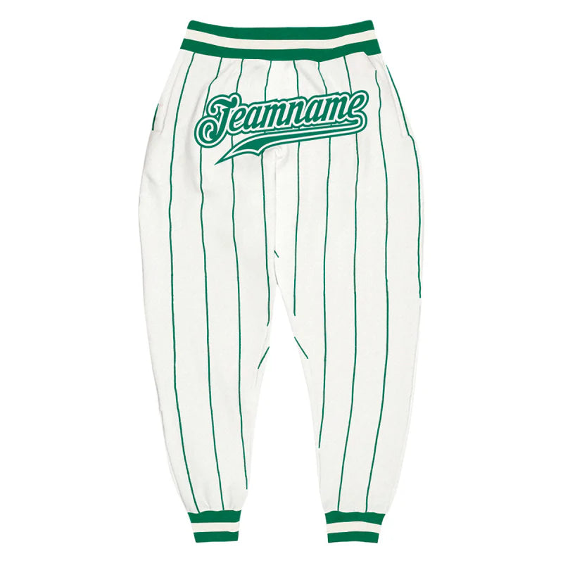 Stay stylish and comfortable with our Custom White Kelly Green Pinstripe Kelly Green-White Sports Pants. Designed for athletes, these pants provide custom sizing and a unique pinstripe design in a classic white and kelly green color combination. Perfect for any sport, these pants will keep you looking and feeling your best on the field or in the gym.