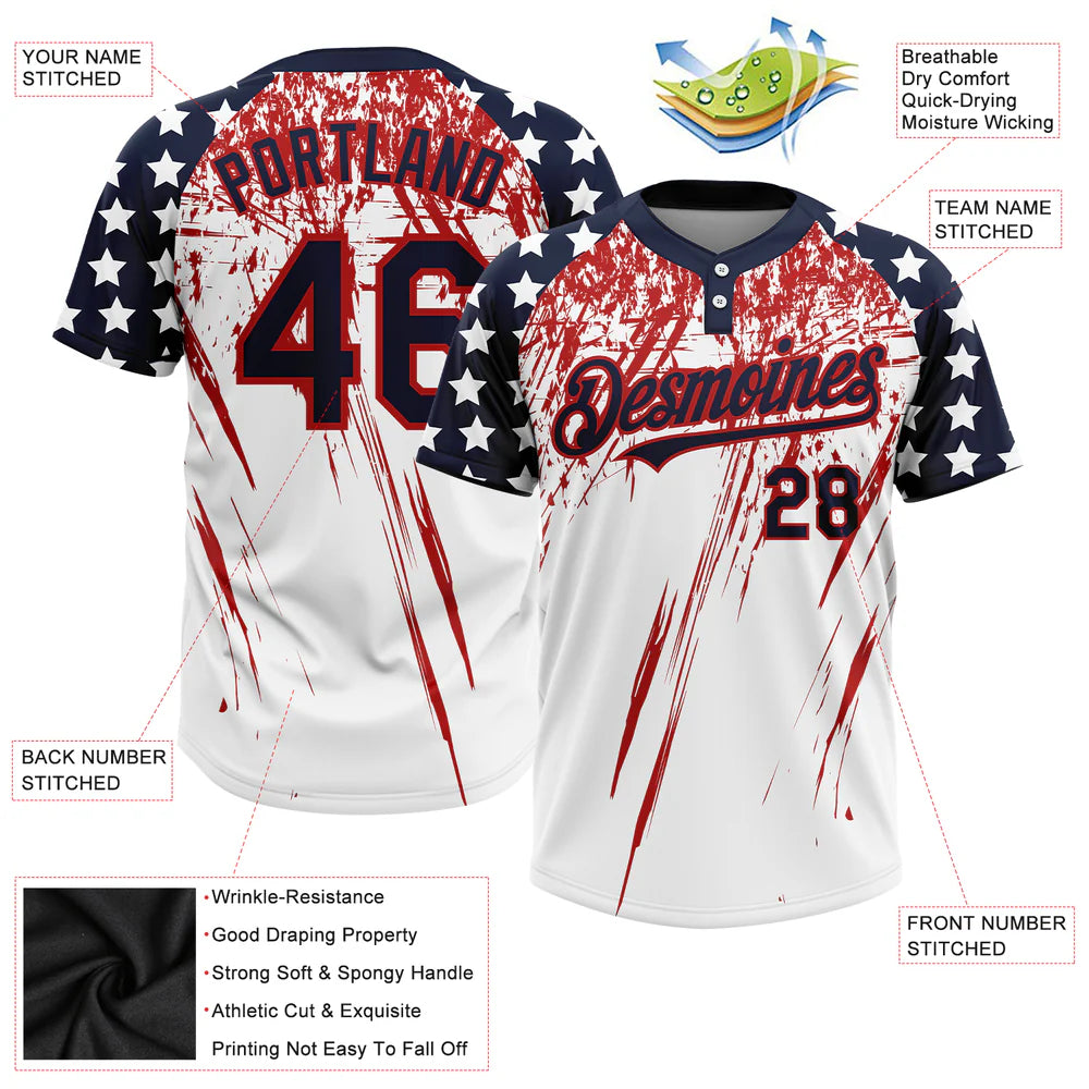 Custom White Navy-Red 3D American Flag Fashion Two-Button Unisex Softball Jersey
