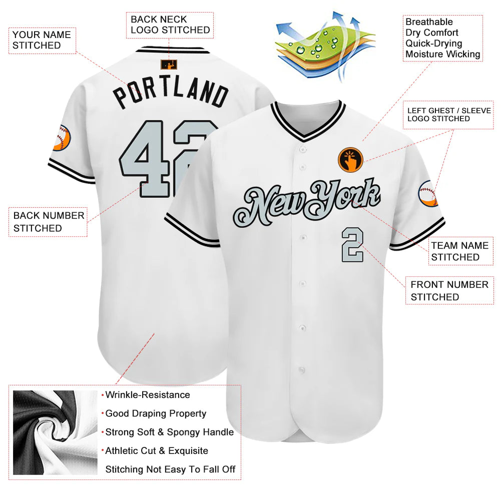 Expertly crafted for a professional look, this Custom White Silver-Black Authentic Baseball Jersey is the perfect addition to any team's uniform. Made with high-quality materials, this jersey offers both style and durability. Stand out on the field with a unique and personalized jersey.