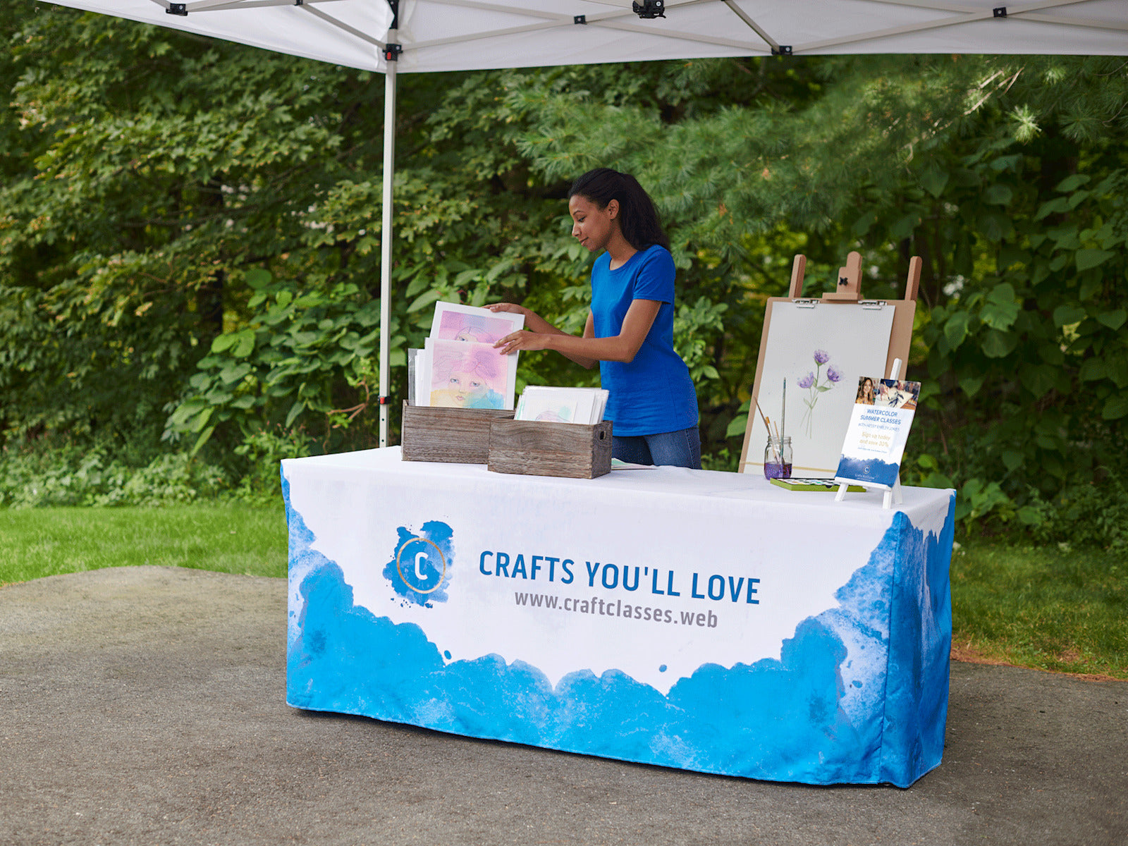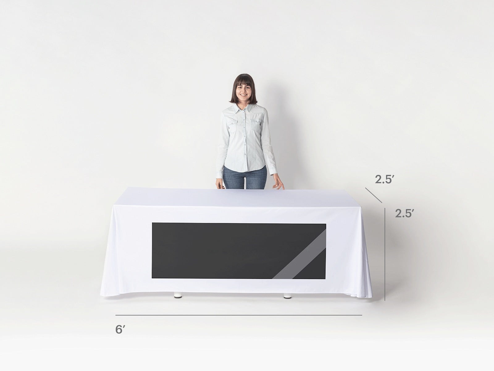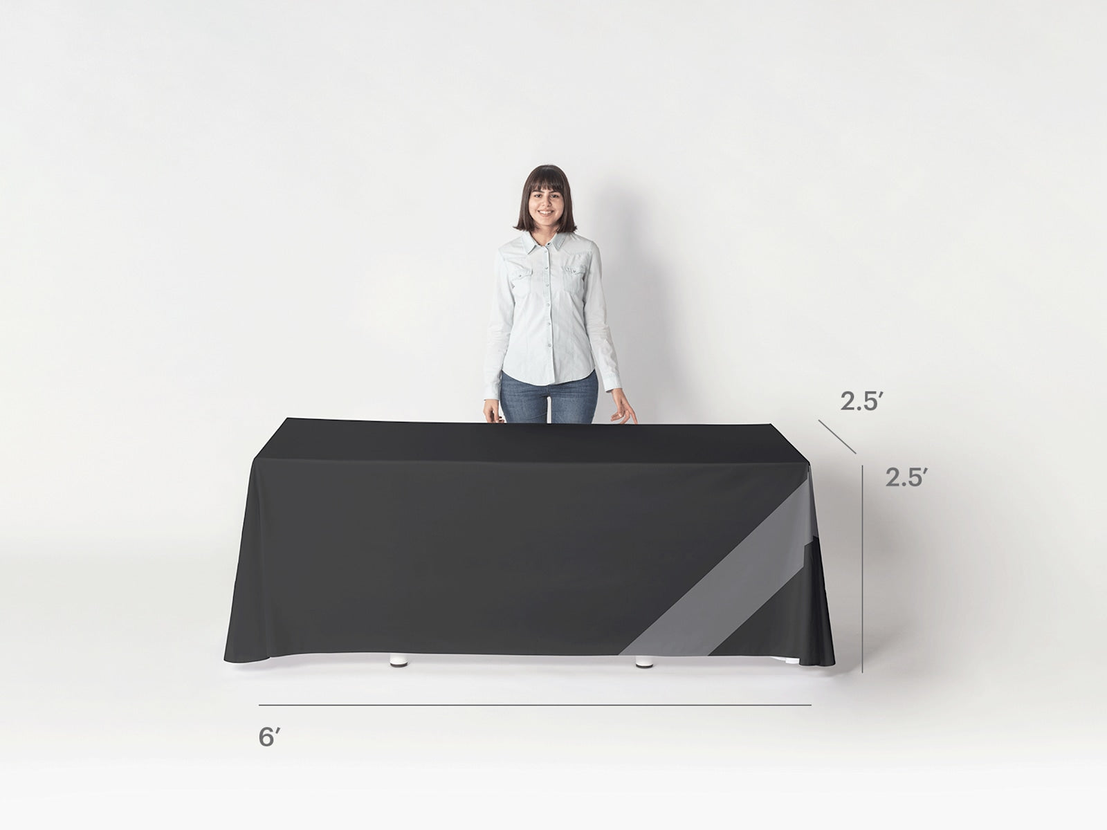 Print custom table covers for standard 6’ tables at trade shows, conventions, and other indoor events.
